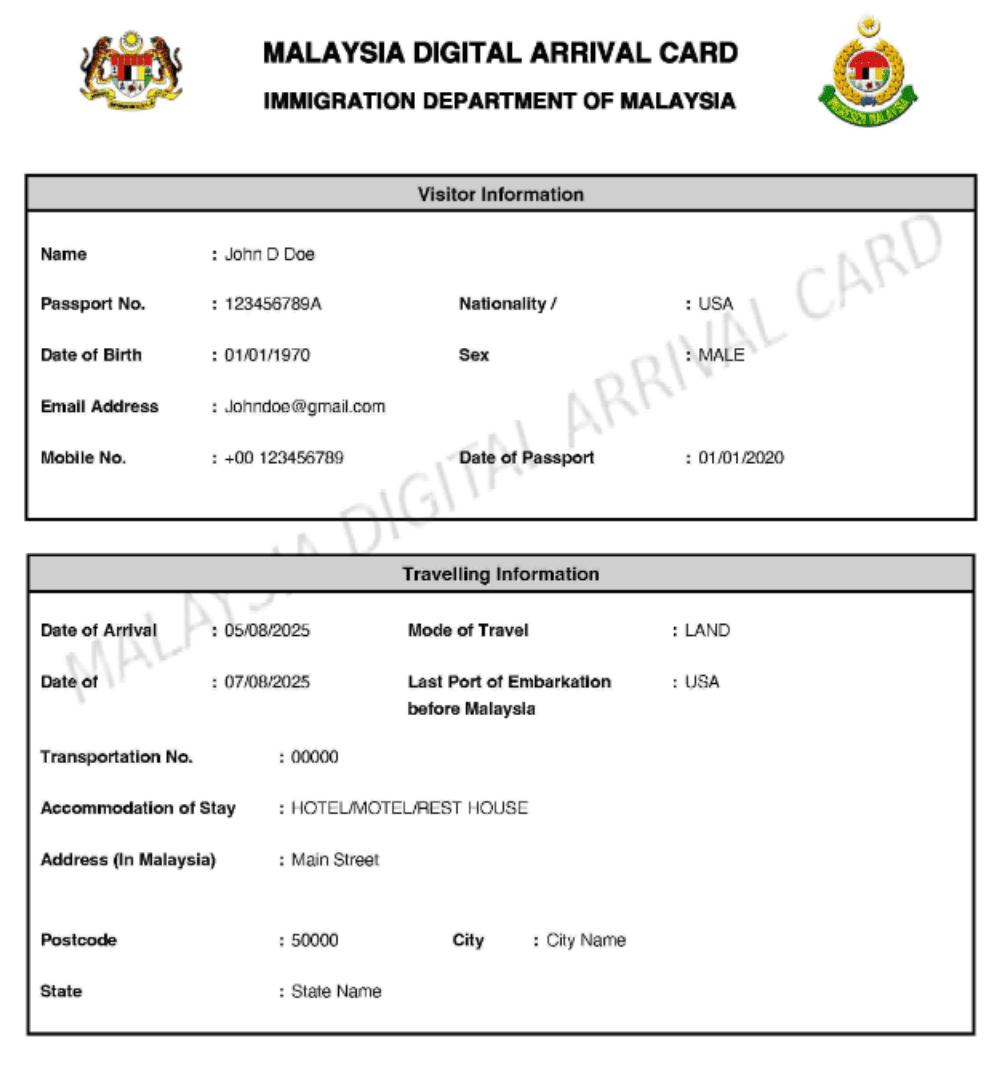 Example of a Malaysia Arrival Card MDAC Confirmation Email (For Reference Only)